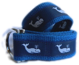 This nautical White Whale print was selected by us and made for you! This ribbon belt is from our Signature Series Line. Each belt is hand made and made to order. This belt is pictured with our 'Brass' color Signature D-Ring.