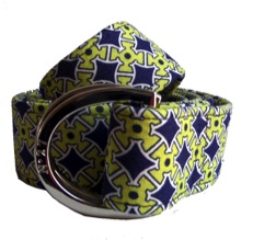 This fun "Navy and Yellow/Green' print, will certainly add flare and brighten any style outfit to completion. This style was selected by us and made for you! This fabric belt is from our Signature Series Line. Each belt is hand made and made to order. This belt is pictured with our 'silver' color buckle or you can select from our other styles.
