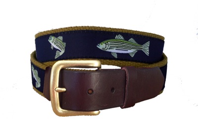 This nautical Striped Bass print was designed by us and made for you! This ribbon belt is from our Signature Series Line. Each belt is hand made and made to order. This belt is pictured with our 'Brass' color buckle. If you would like our 'Pewter' style, please email us and we can easliy make the change.