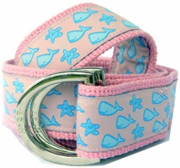 This nautical Whales and Starfish print was designed by us and made for you! This ribbon belt is from our Signature Series Line. Each belt is hand made and made to order. This belt is pictured with our 'Silver' color Signature D-Ring.